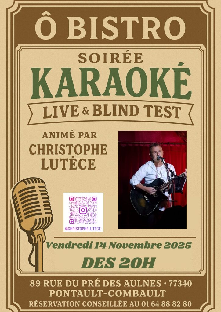 Rendez-vous vendredi 14 novembre 2025 dès 20h au Ô Bistro à Pontault-Combault pour une soirée karaoké et blind test animée par Christophe Lutèce !